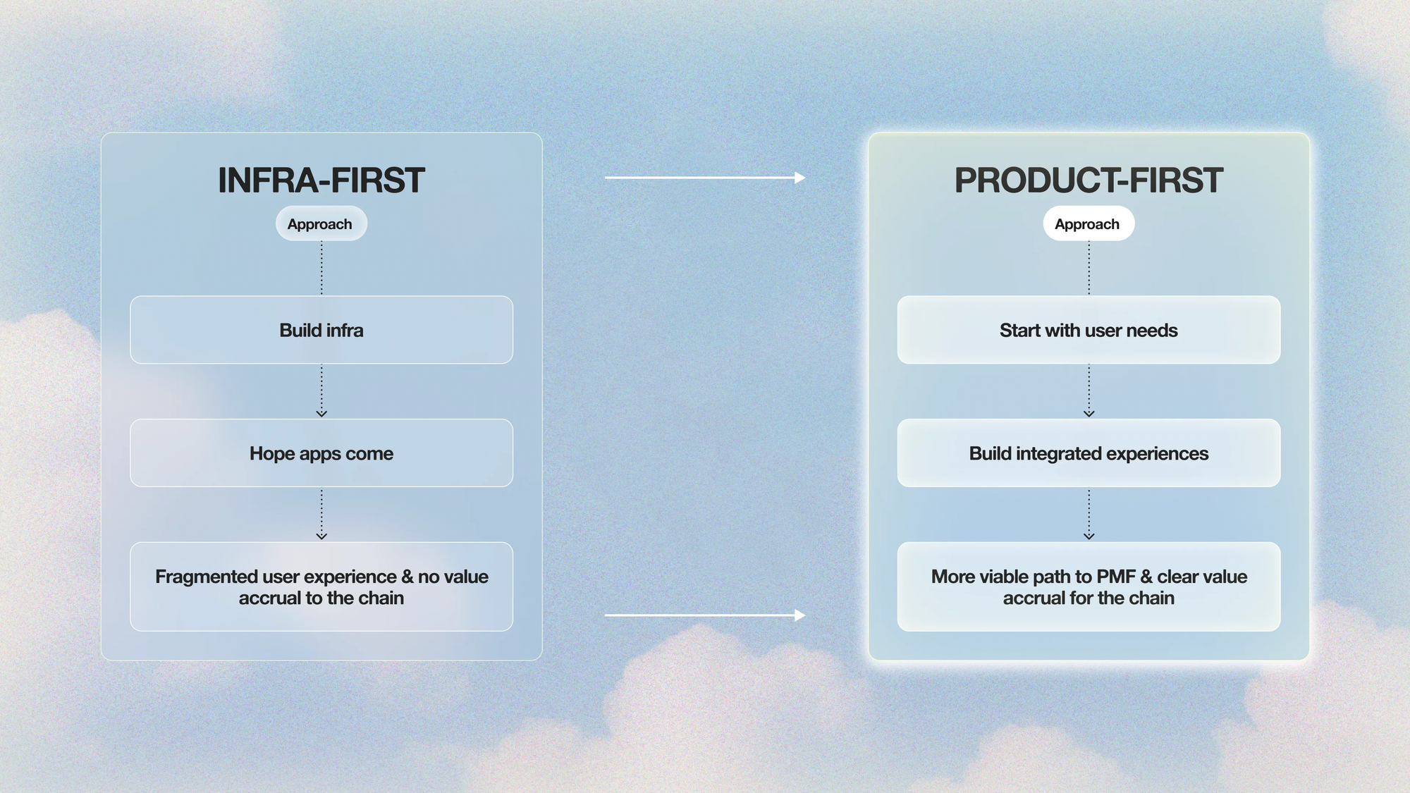 - Truth: PMF is found at the app layer. Stop waiting for third-party ecosystems to carry us. Build the product ourselves.