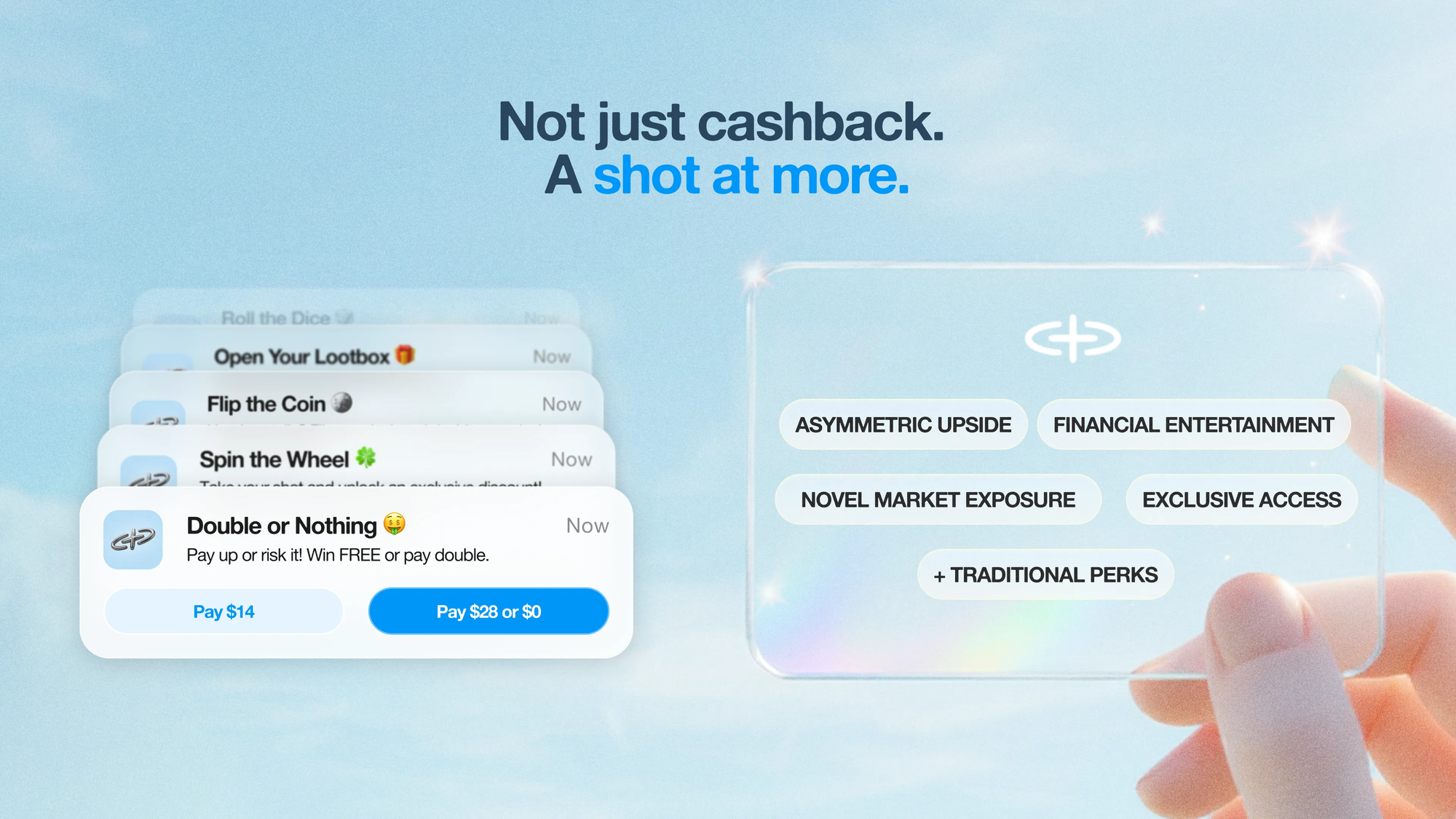 In the short term, we’ll win the category on product quality & design alone - by applying crypto’s most powerful insight, gamified upside, to everyday spending. Instead of fixed, forgettable rewards, we turn daily activity into optional shots at something bigger.