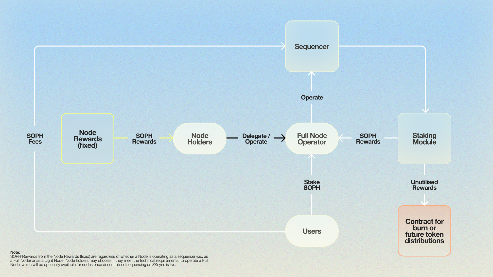 Staking launches at TGE, with the Sophon Foundation initially operating the only Full Node. Once decentralised sequencing is enabled by the ZKsync network, Full Nodes must stake 100,000 SOPH to operate and will earn a portion of gas fees. Remaining fees are distributed to SOPH stakers.